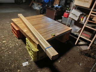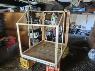 低くしたおかげで、屋根がある駐車場の下で作業することができる。とりあえず、フレームを形にした。